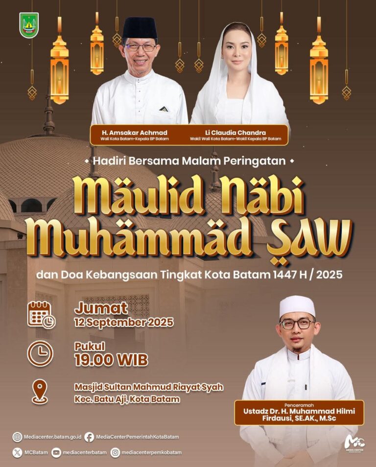 Namirahbatam.or.id Pemerintah Kota Batam mengundang seluruh masyarakat untuk bersama-sama menghadiri Malam Peringatan Maulid Nabi Muhammad SAW 1447 H/2025 sekaligus D’oa Kebangsaan Tingkat Kota Batam yang akan digelar pada Jumat, (12/09/2025) pukul 19.00 WIB di Masjid Sultan Mahmud Riayat Syah, Kecamatan Batu Aji, Kota Batam.