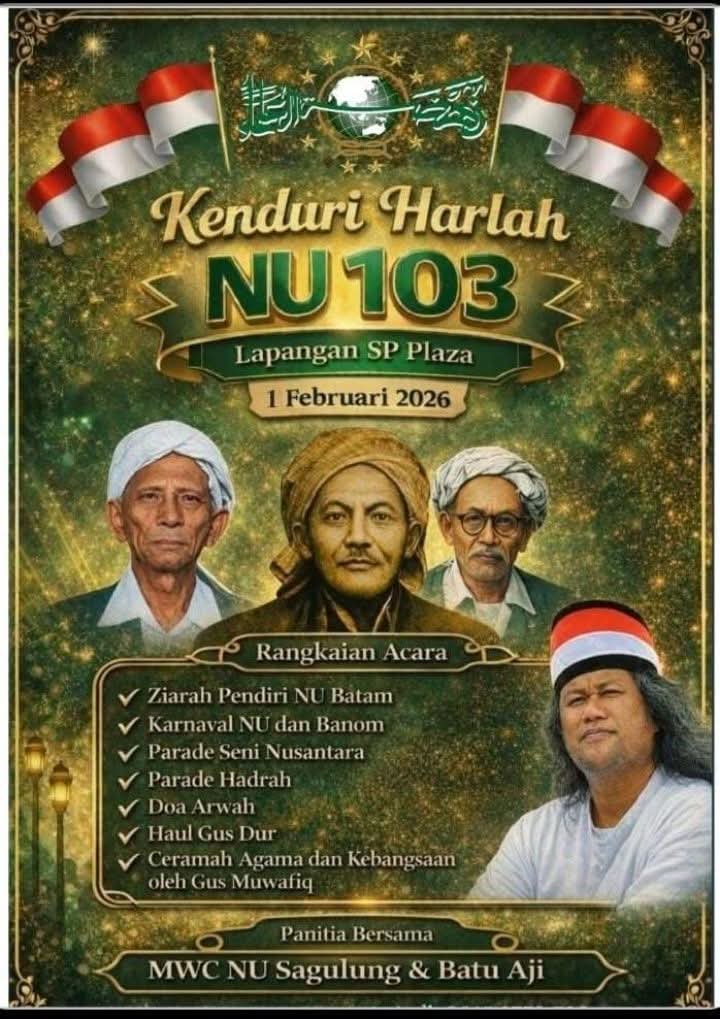 PANITIA BERSAMA MWC NU SAGULUNG dan MWC NU BATU AJI mengundang Kaum Muslimin Wal Muslimat dalam Kenduri Harlah NU ke 103 TH Tanggal 1 Februari 2026 di Lapangan SP PLAZA Kota Batam Bersama Gus Muwafiq dari Yogyakarta.