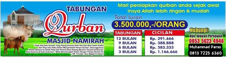 Mari kita berpartisipasi dengan semata mata mengharap Ridho Allah SWT dengan berniat tahun ini untuk dapat menunaikan Qurban di Masjid Namirah yang insya allah akan di laksanakan pada hari Rabu, 26 Mei 2026.
