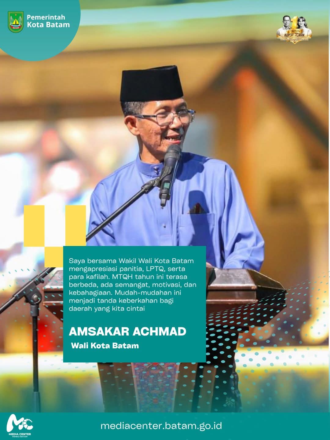 Wali Kota Batam, Amsakar Achmad, dalam sambutannya mengajak masyarakat untuk menjadikan MTQH sebagai momentum memperkuat nilai-nilai Al-Qur’an dalam kehidupan sehari-hari.