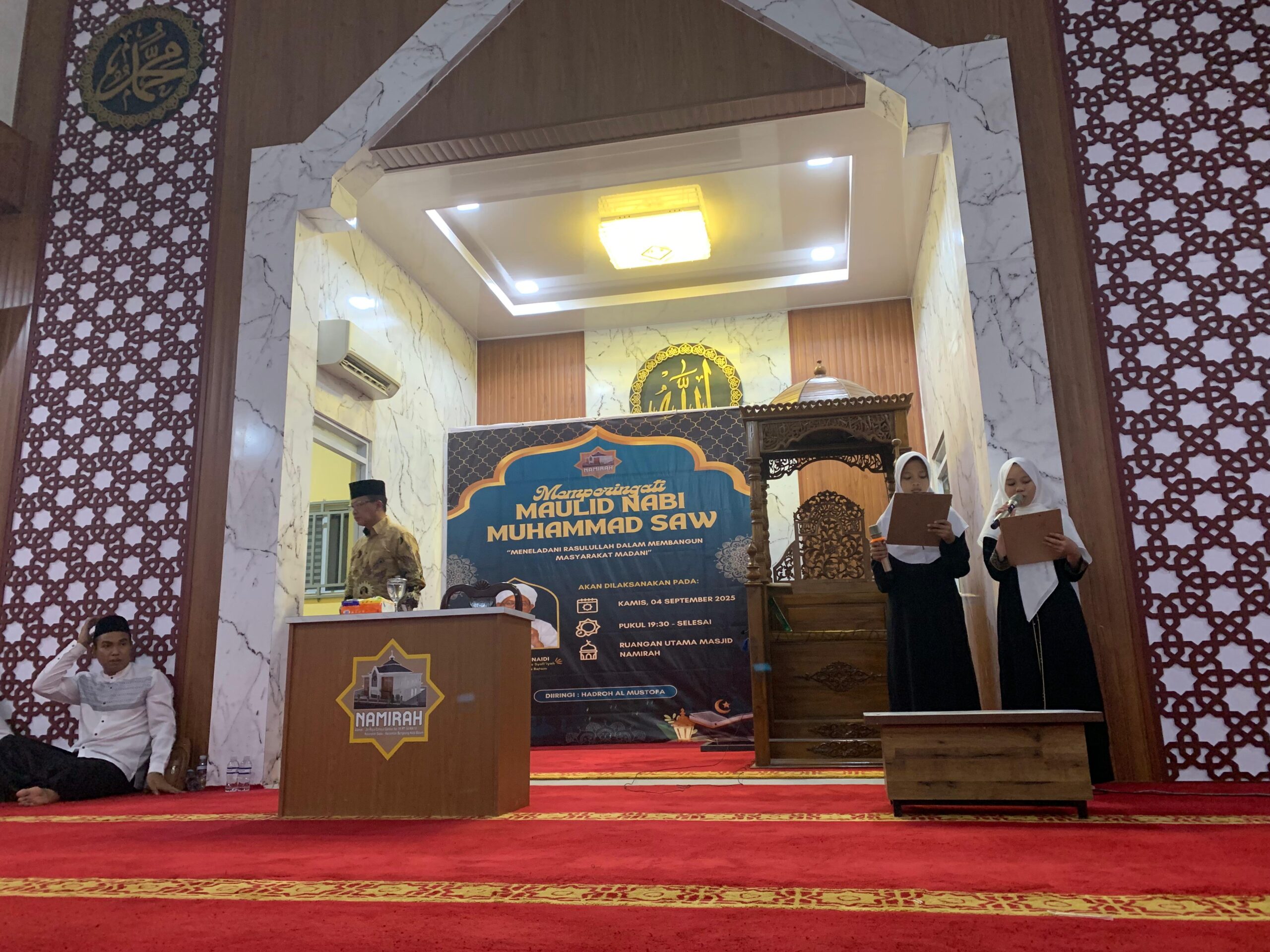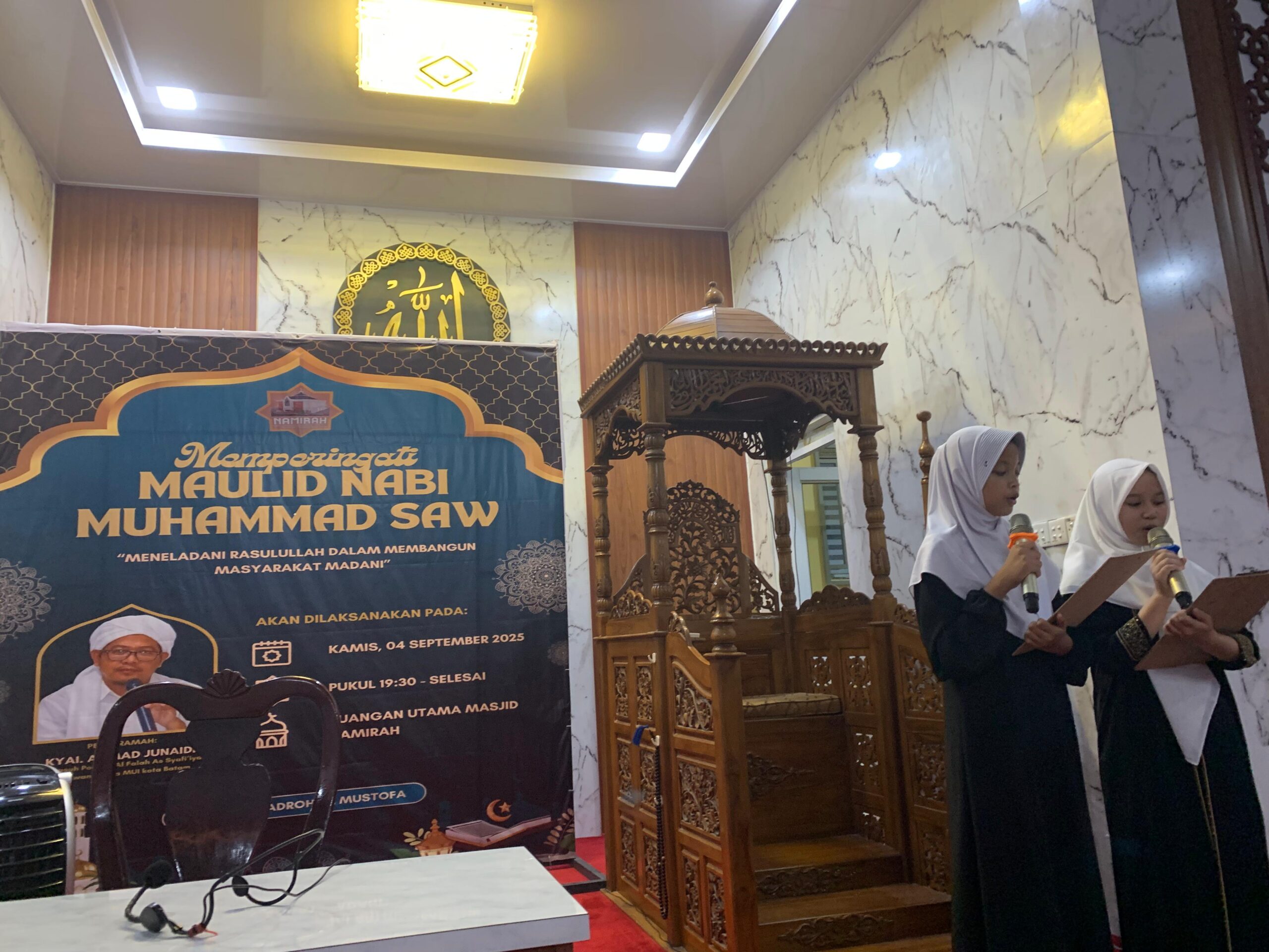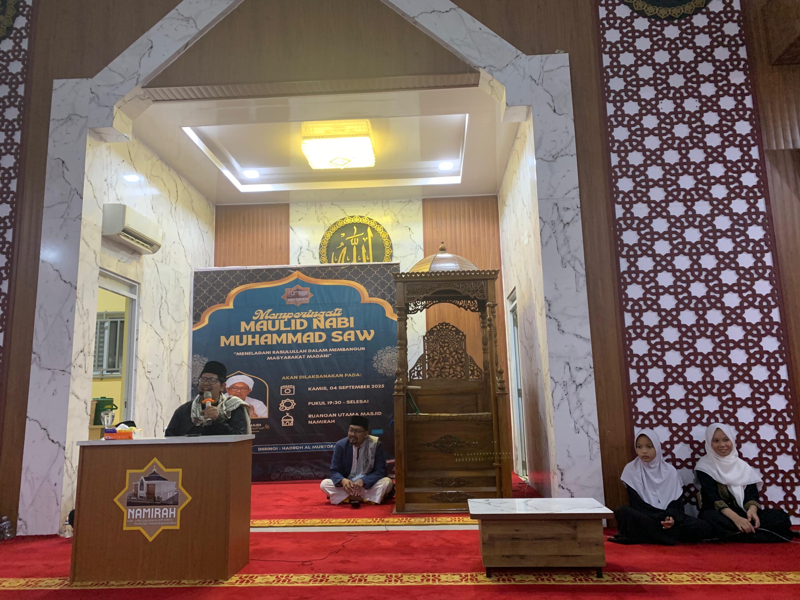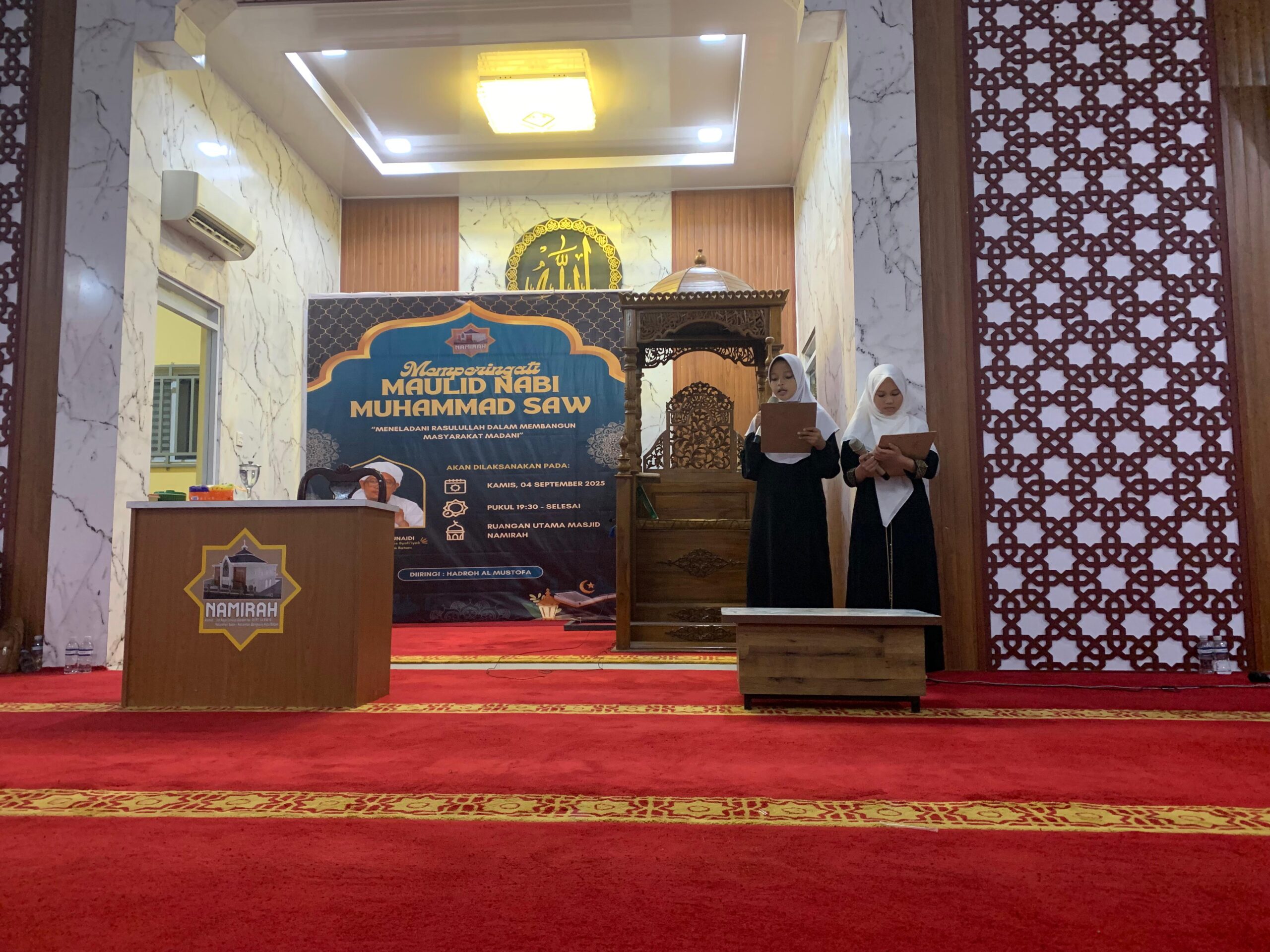 Acara dimulai dengan penampilan memukau Hadroh Al Mustofa binaan Ustadzah Siti Rohana yang menghidupkan suasana Maulid di dalam Ruang Utama Masjid Namirah.
