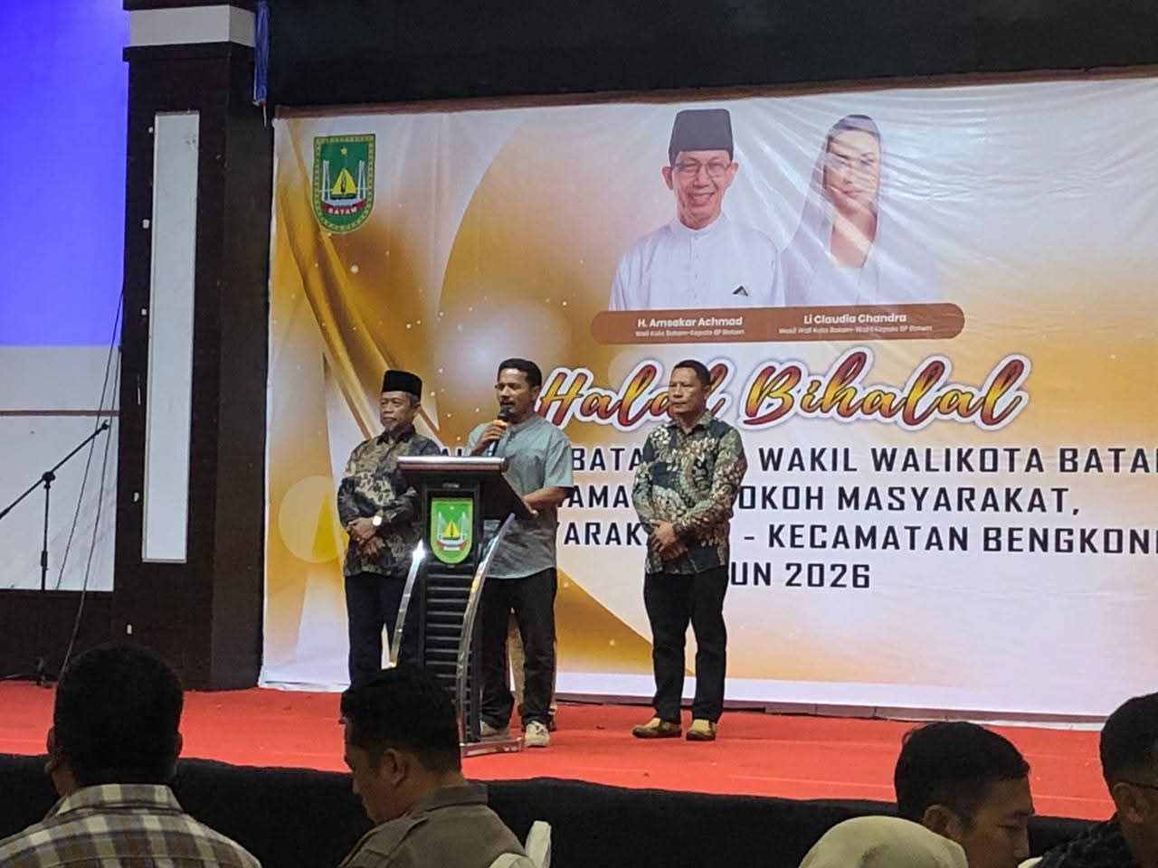 Walikota Batam, DR.H. Amsakar Achmad, S.Sos., M.Si., bersama Wakil Walikota, Li Claudia Chandra, menghadiri kegiatan Halalbihalal dengan Masyarakat Kecamatan Bengkong pada Rabu (01/04/26) malam.