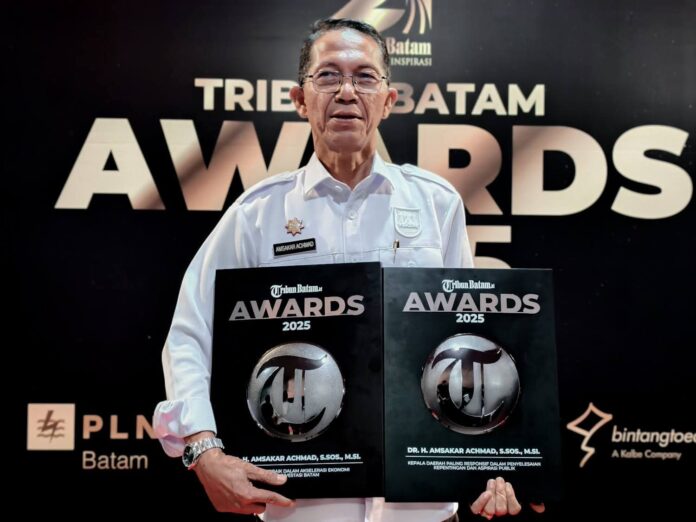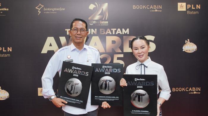 Namirahbatam.or.id – Wali kota Batam sekaligus Kepala Badan Pengusahaan (BP) Batam, Amsakar Achmad bersama Wakil Walikota sekaligus Wakil Kepala BP Batam, Li Claudia Chandra saat menerima penghargaan Awards dari Tribun Batam, Senin (27/10/2025).